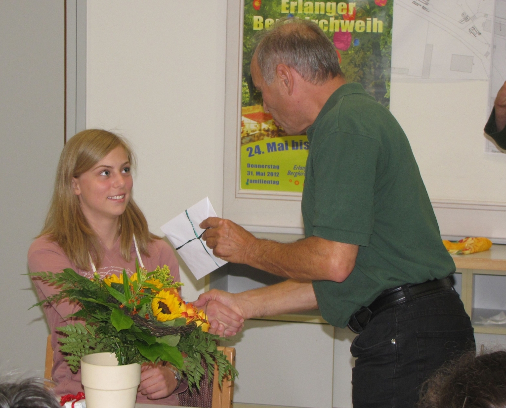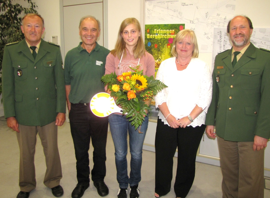 Bei einem kleinen Empfang in der Polizeiinspektion am Montag, den 30. Juli, gratulierten Bürgermeisterin Birgitt Aßmus, Polizeichef Adolf Blöchl, ihre Schulleiterin vom Ohm-Gymnasium, Ilsedore Fuchs, der Polizist Werner Dorn und Georg Gebhard von der Verkehrswacht Erlangen der sympatischen Siegerin zu ihrem Erfolg. Dem Betreuer der Schülerlotsen, Stefan Dorsch, wurde für sein erfolgreiches Wirken gedankt.