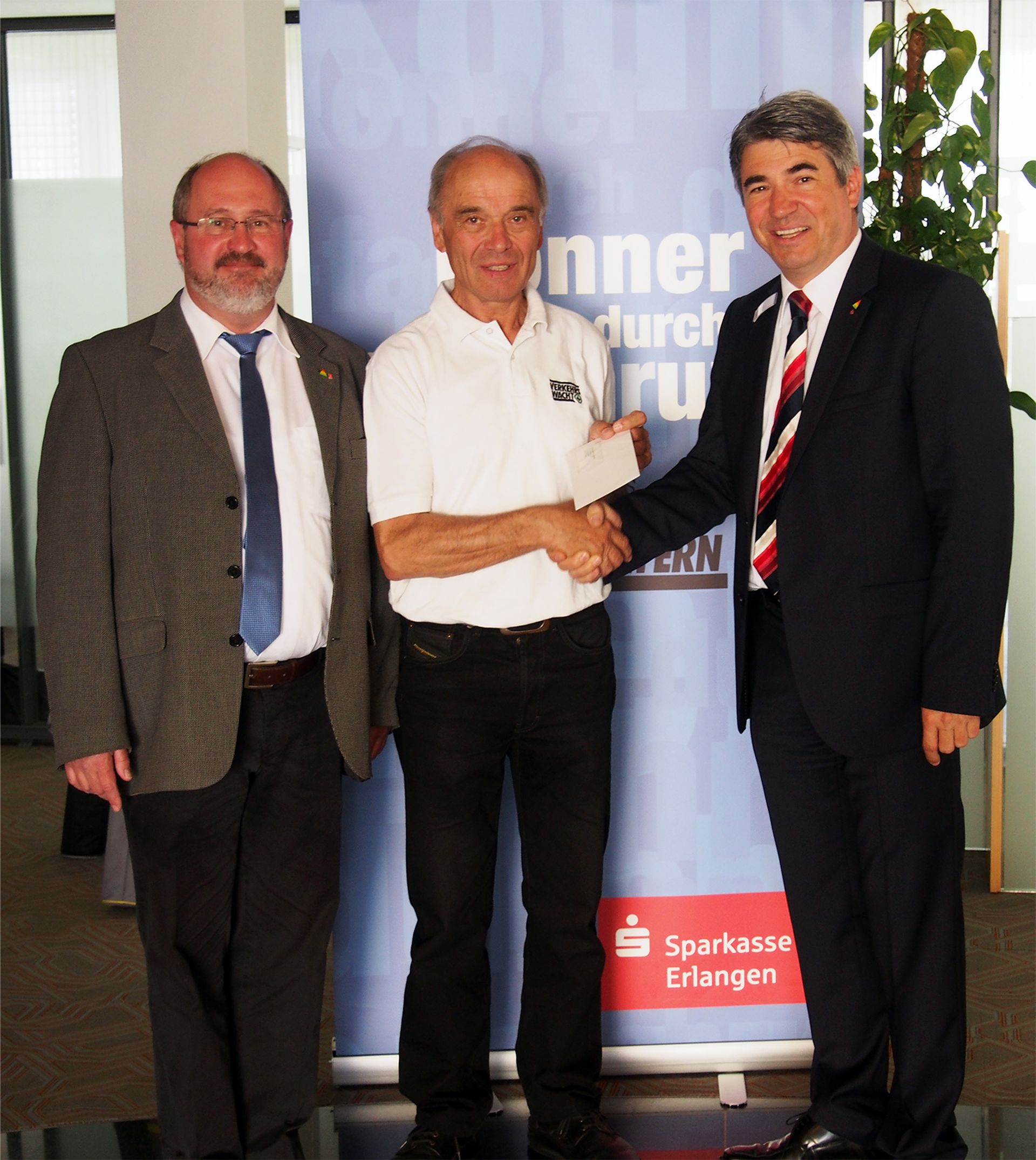 Werner Rometsch, Direktor Marke- ting und Vertrieb in der Sparkasse Erlangen (rechts), übergibt an den Vorsitzenden der Verkehrswacht Erlangen, Georg Gebhard (mitte), im Beisein von "Könner"-Projekt- leiter Rainer Dorn, einen Brief des Vorstandes, mit der Zusage zur finanziellen Unterstützung für das Jahr 2014.