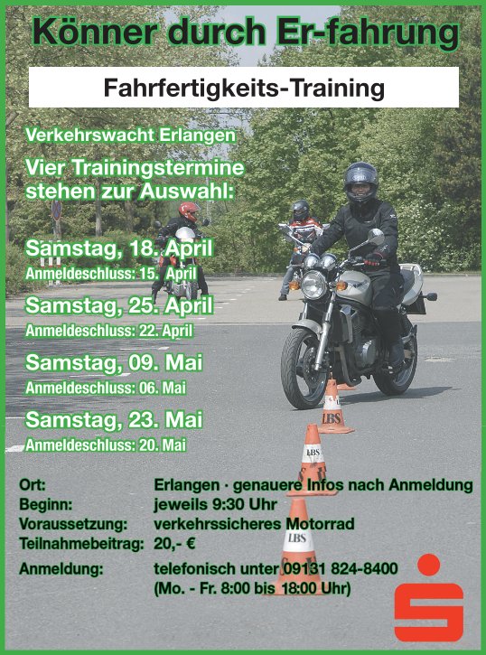 Herzlich Willkommen auf den Webseiten der Erlanger Verkehrswacht!AktuellesKönner-Training für Motorräder